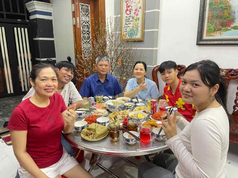 Mâm cỗ cuối năm đầy đủ các món. Cả nhà quây quần, ôn lại chuyện cũ, cười nói rôm rả. Không khí vừa vui vừa bùi ngùi khi một năm sắp qua.