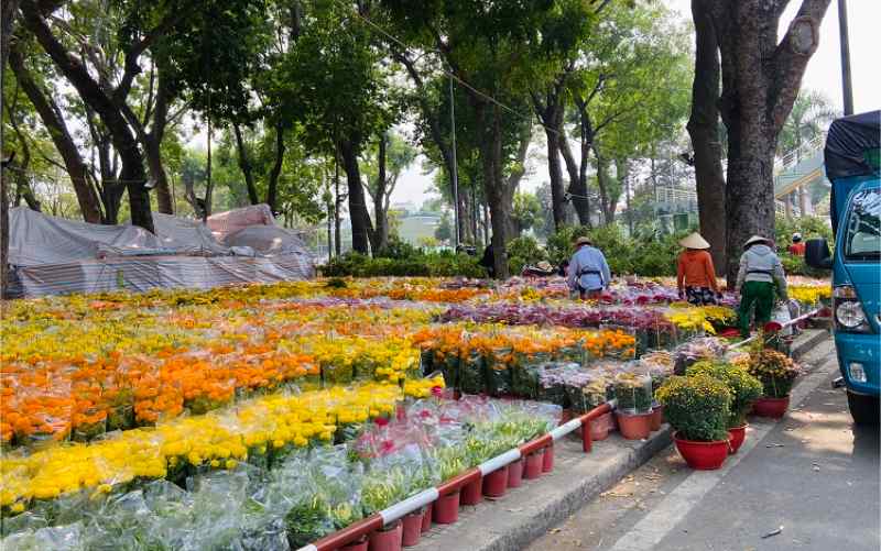 Chợ hoa ngày Tết mở từ 23 tháng Chạp, nhộn nhịp nhất vào đêm 30. Mỗi gia đình chọn cho mình một cành mai, chậu cúc — lựa chọn đó là cả một nghi thức chào đón mùa Xuân.